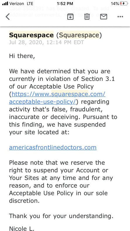 Maintenant, le fondateur de America’s Frontline Doctors, le Dr Simone Gold, a déclaré dans un tweet récent: «L’ hébergeur de notre site Web @Squarespace  vient de fermer complètement et arbitrairement notre site Web, affirmant une violation de leurs conditions de service.»
